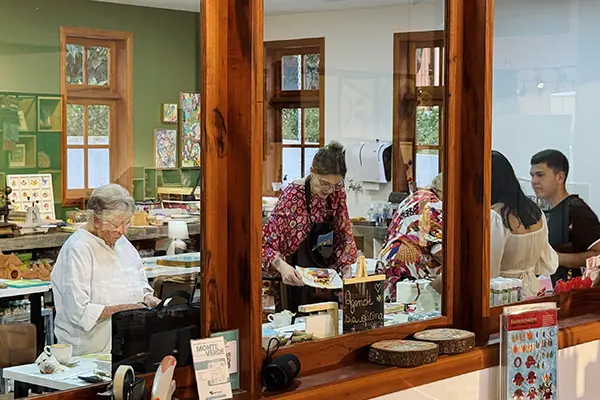 Nosso Espaço de Arte também conta com uma loja muito exclusiva, com produtos artesanais e artísticos produzidos aqui mesmo, e também com uma curadoria especial e artesanatos de Minas Gerais muito especiais. Nossa especialidade é a Pintura Bauernmalerei, técnica de pintura floral decorativa, de origem alemã, e que é Patrimônio Cultural da Vila de Monte Verde. Aqui você pode encontrar pratos de madeira, casas de passarinho, bandejas, caixas, móveis e até pequenas lembranças como enfeites e imãs de geladeira feitos nessa linda técnica folclórica. Além disso temos também uma série de gravuras e serigrafias com as árvores de nossa Serra da Mantiqueira, entre outras lindas sugestões.